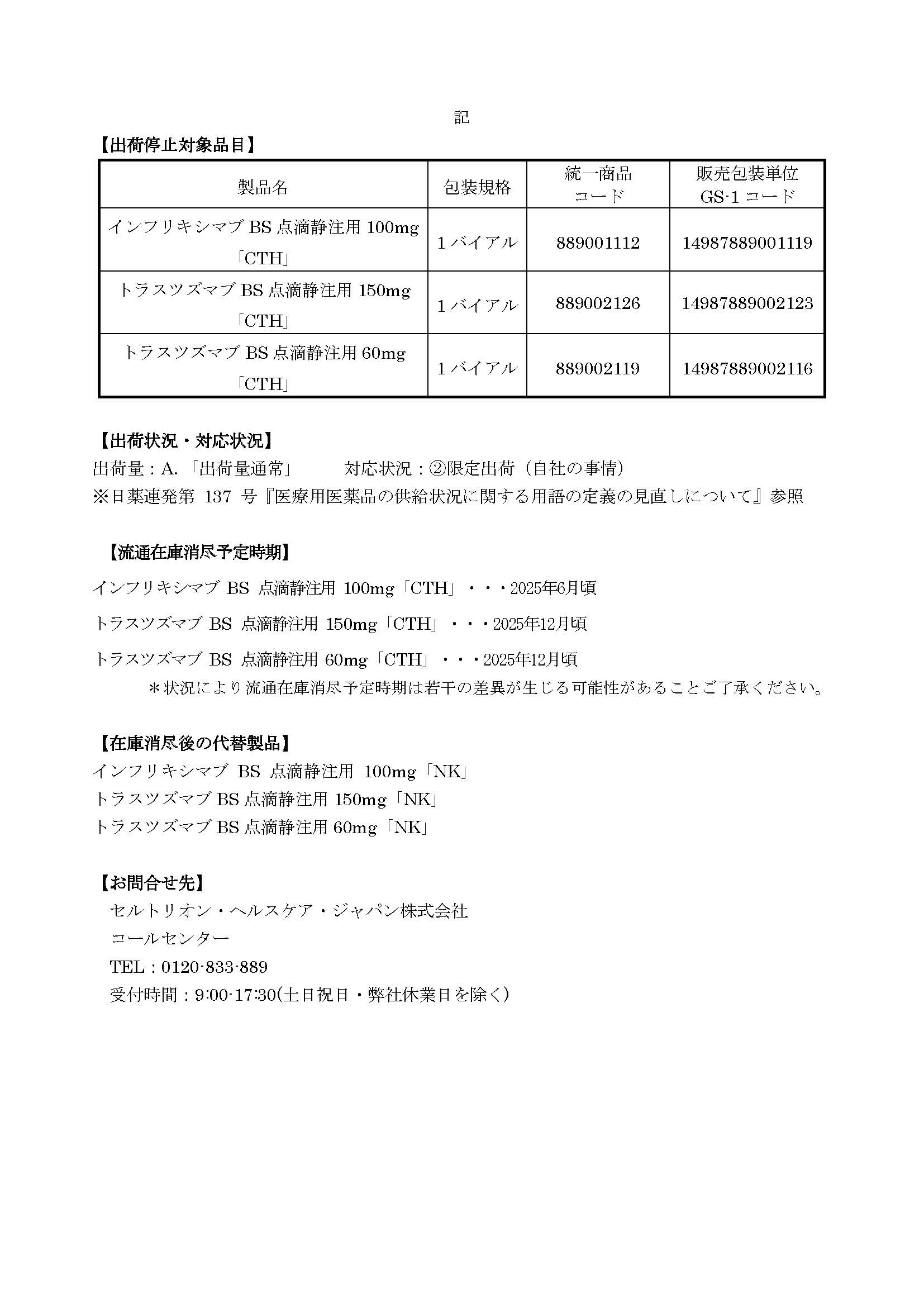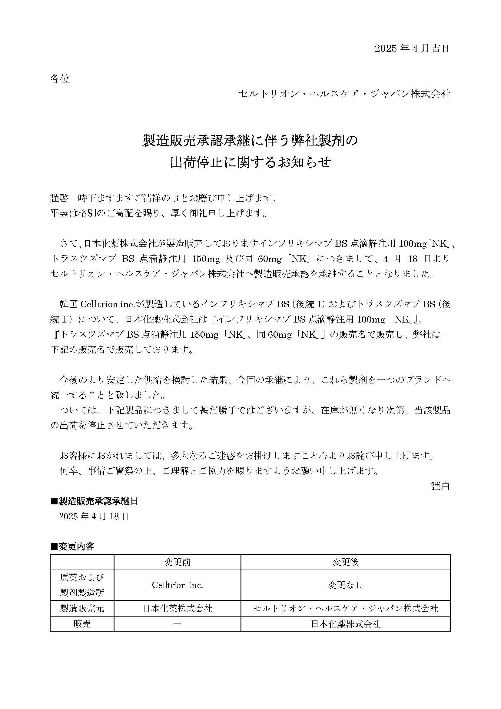 製造販売承認承継に伴う弊社製剤の出荷停止に関するお知らせ 2025.04.18 添付ファイルをダウンロード 20250418_製造販売承認承継に伴う弊社製剤の出荷停止に関するお知らせ_【HP掲載】.pdf 製造販売承認承継のご案内 ベバシズマブBS「CTNK」_注意事項等情報改訂のお知らせ List