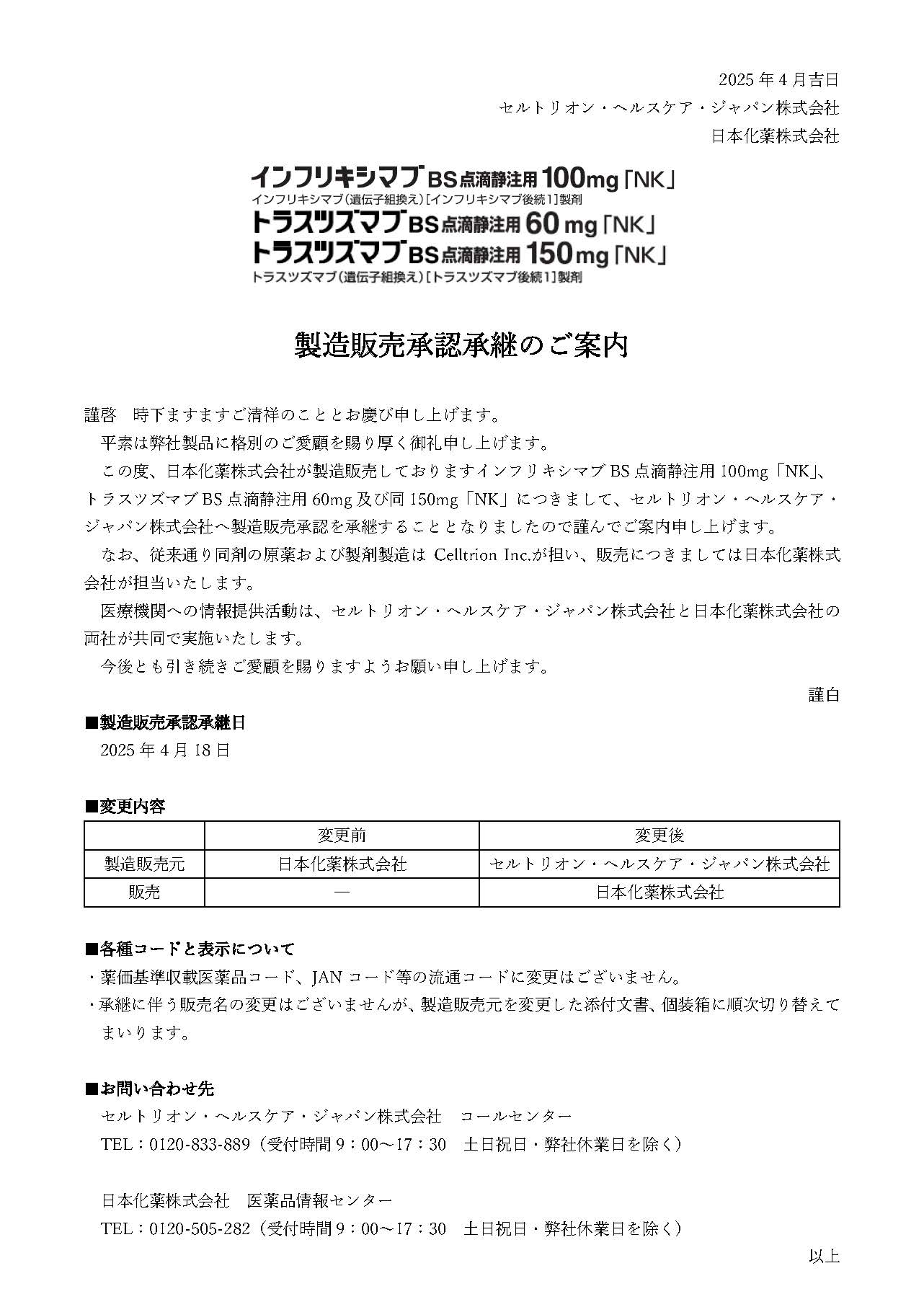製造販売承認承継のご案内 2025.04.18 添付ファイルをダウンロード 20250418_製造販売承認承継のご案内.pdf 製造販売承認承継に伴う弊社製剤の出荷停止に関するお知らせ 製造販売承認承継に伴う弊社製剤の出荷停止に関するお知らせ List