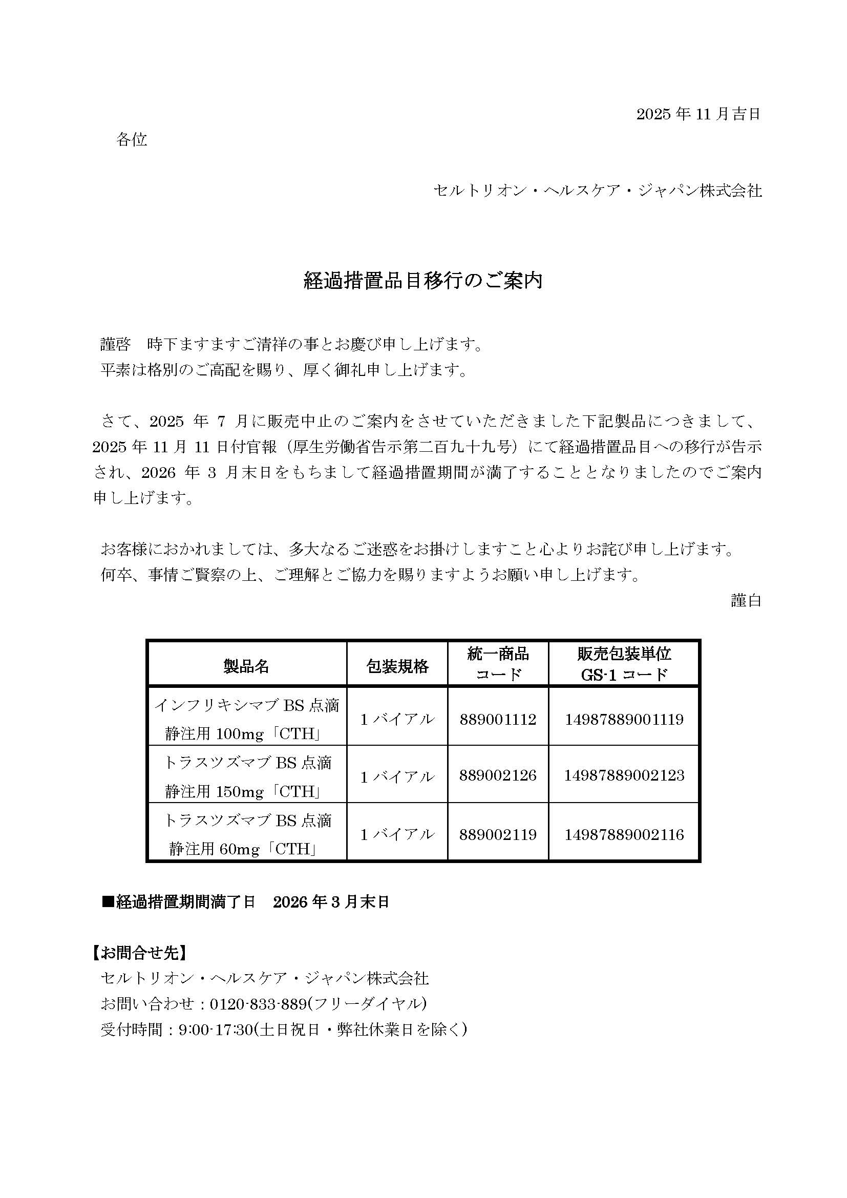 経過措置品目移行のご案内 2025.11.17 添付ファイルをダウンロード 20251117_経過措置品目移行に関するお知らせ_【HP掲載】_11月.pdf 経過措置品目移行のご案内 トシリズマブBS点滴静注「CT」 薬価基準収載のお知らせ List