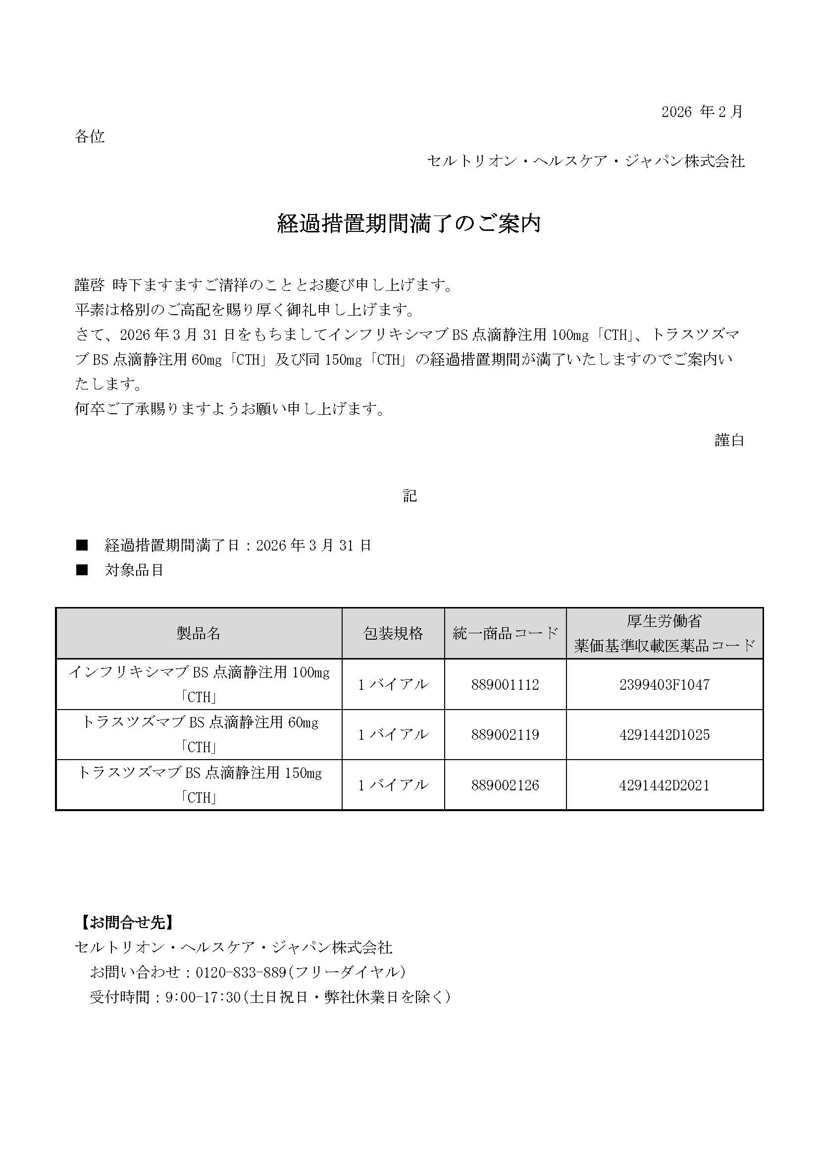 経過措置期間満了のご案内 2026.02.02 添付ファイルをダウンロード 【web掲載用】経過措置満了のお知らせ(CT-P6_13).pdf There are no next posts. 経過措置期間満了のご案内 List