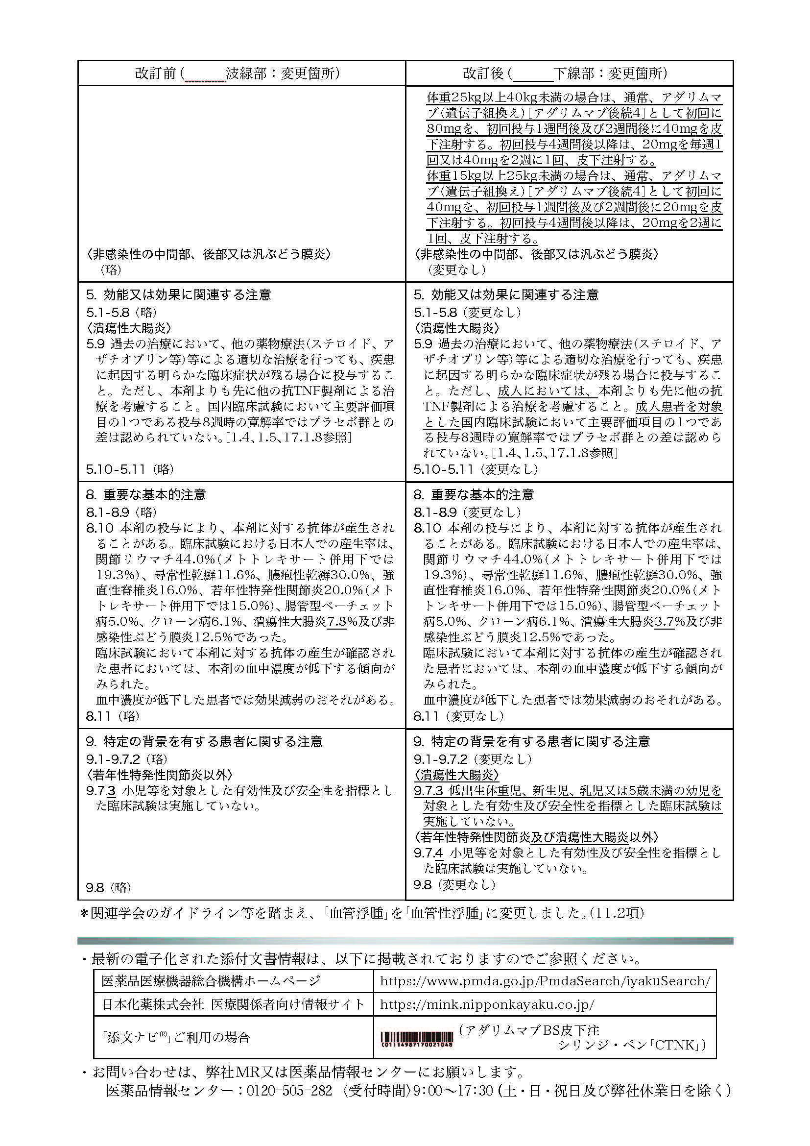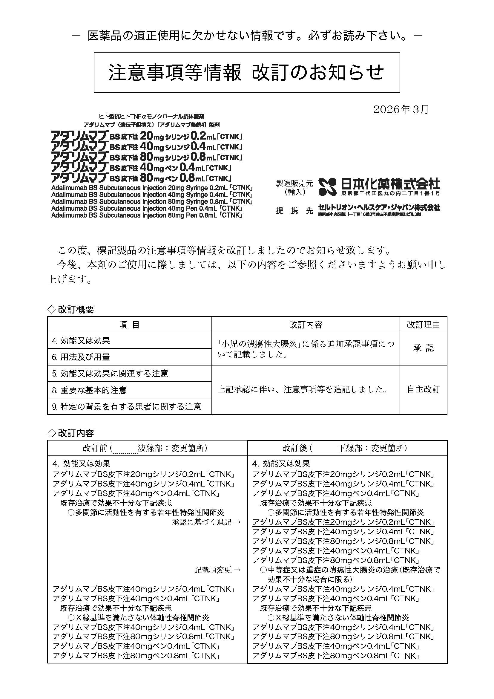 アダリムマブBS「CTNK」_注意事項等情報改訂のお知らせ 2026.03.25 添付ファイルをダウンロード 20260325_アダリムマブBS「CTNK」_注意事項等情報改訂のお知らせ.pdf There are no next posts. インフリキシマブBS「NK」使用上の注意改訂のお知らせ List