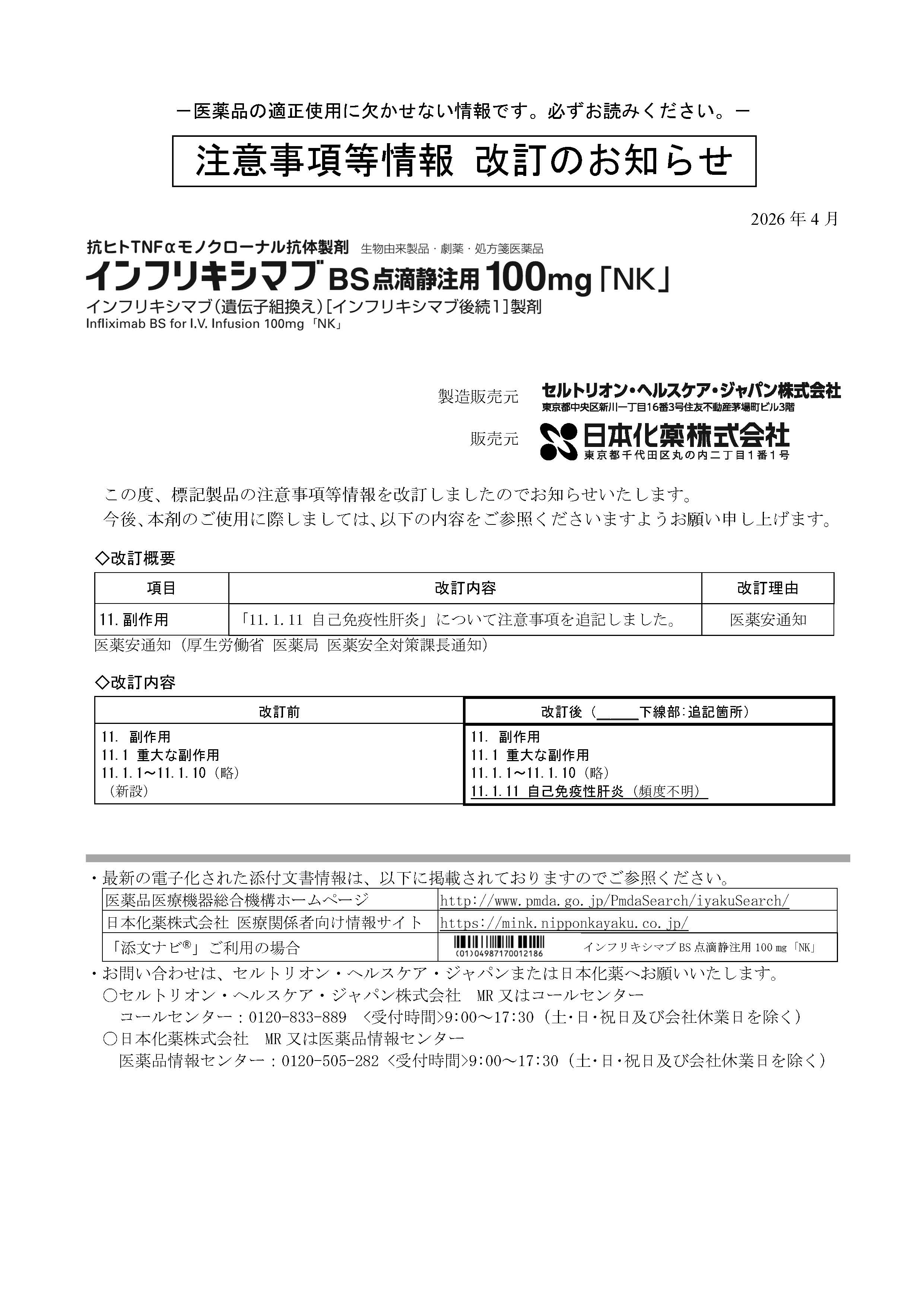 インフリキシマブBS「NK」_注意事項等情報の改訂のお知らせ 2026.04.21 添付ファイルをダウンロード CT-P13_①_3_インフリキシマブBS「NK」_注意事項等情報の改訂のお知らせ_202604.pdf There are no next posts. 製造販売承認取得のお知らせ List