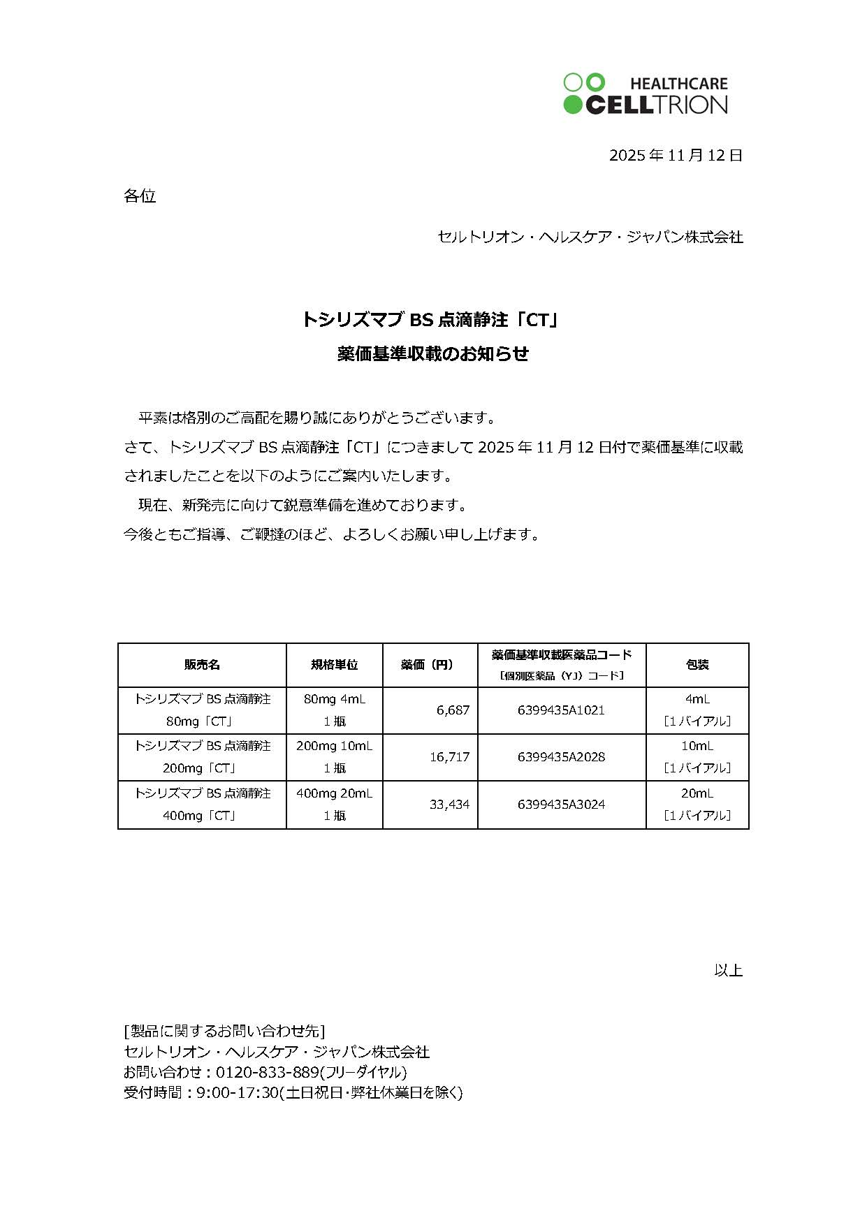 トシリズマブBS点滴静注「CT」 薬価基準収載のお知らせ 2025.11.12 添付ファイルをダウンロード 【画像無】トシリズマブBS「CT」薬価基準収載のお知らせ20251112_webサイト掲載向け.pdf There are no next posts. トシリズマブ(遺伝子組換え)製剤のバイオ後続品(バイオシミラー)の 製造販売承認取得のお知らせ List