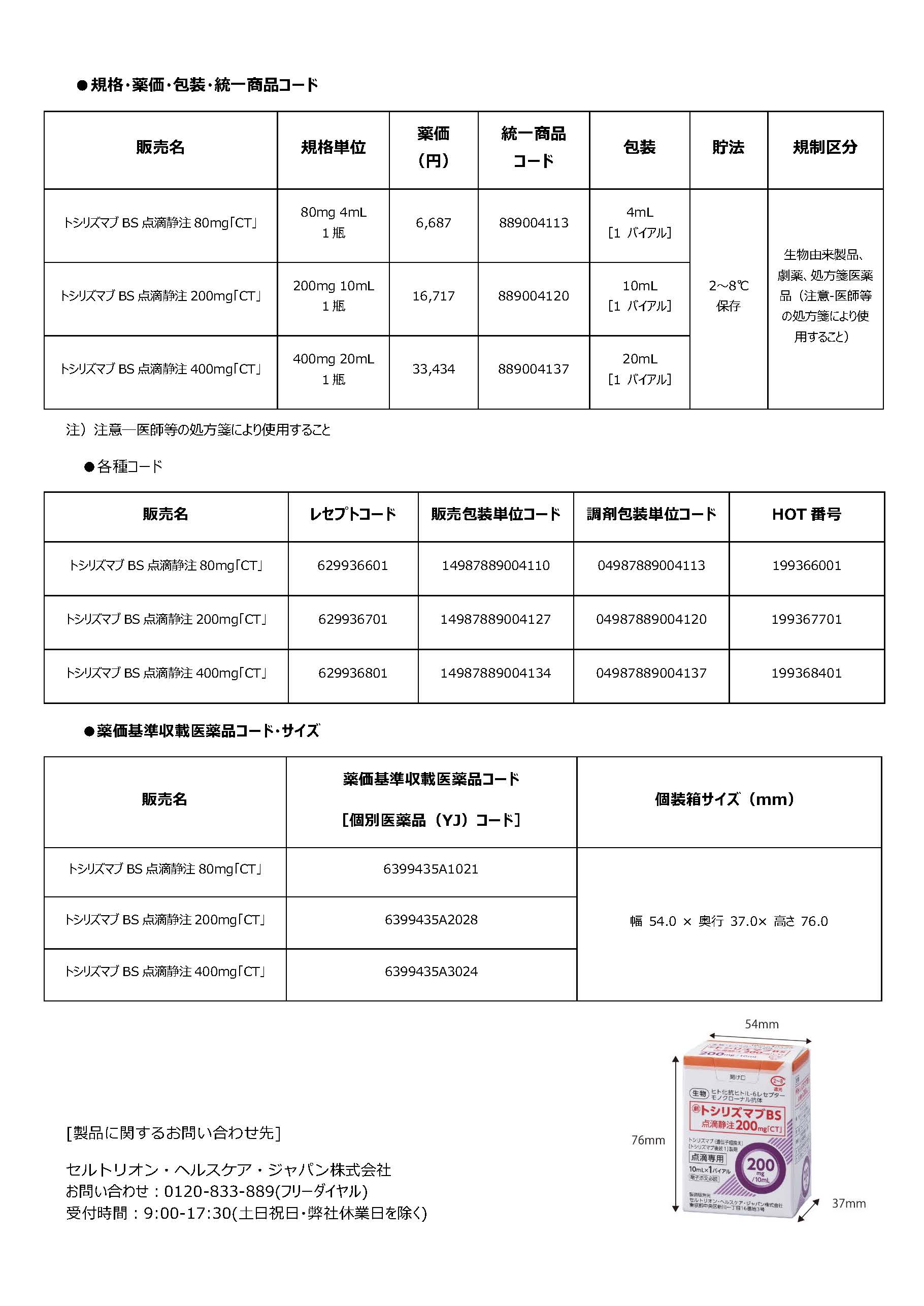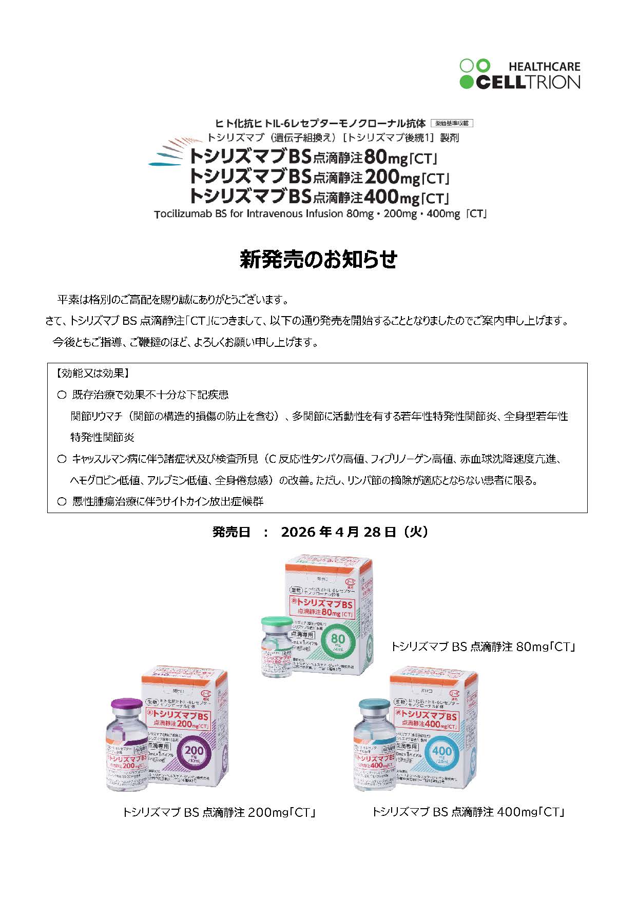 トシリズマブBS点滴静注「CT」新発売のご案内 2026.02.16 添付ファイルをダウンロード 【web用】トシリズマブBS点滴静注「CT」新発売のご案内_20260428.pdf There are no next posts. 経過措置期間満了のご案内 List
